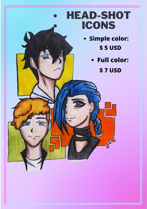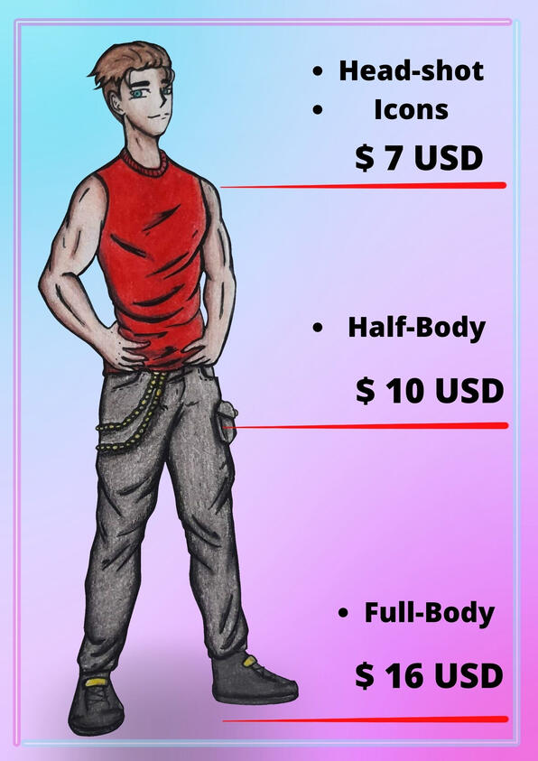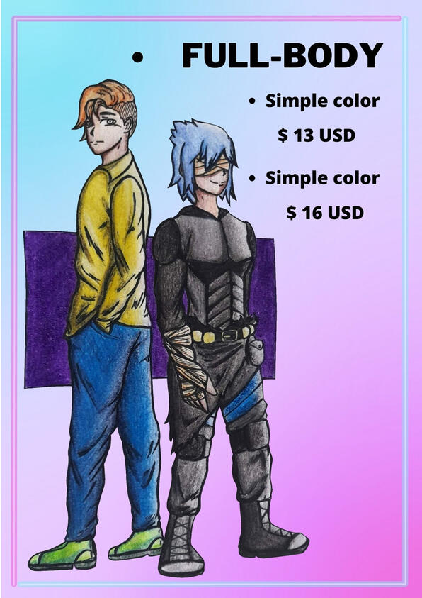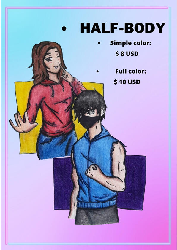 These are tha base prices for headshot/icons, halfbody and fullbody, but if the client asks for a drawing other than these three types the price varies depending on what the client asks for and the difficulty of the commision, this also applies for headshot/icons, halfbody and fullbody